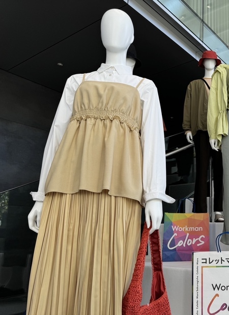 毎年大人気の撥水プリーツスカート。会場では清潔感のあるブルー(新色)のスカートに薄いイエローのトレーナー、シルバーのサンダルを合わせた爽やかなコーディネートが印象的でした。