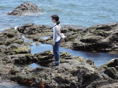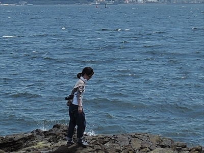 島の浦賀水道側の岩場にも行った。先ほどの岩場より開けている。強風。