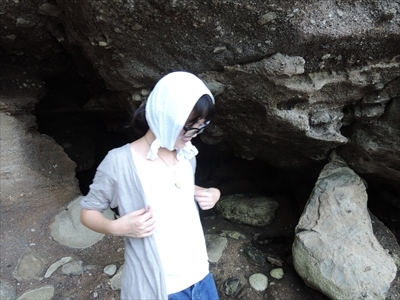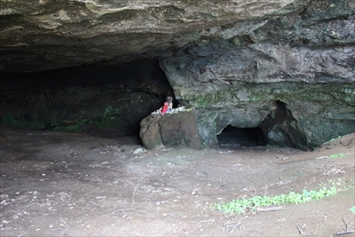 階段の途中の崖面にある洞窟。1253(建長)年、日蓮が避泊したといわれている洞窟だが、弥生時代の住居跡でもある。ここから弥生土器と人骨が出土された。
