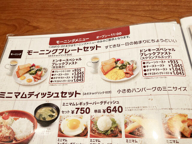 びっくりドンキーのモーニングは、300円台の卵かけご飯から1,000円超えのバーグディッシュシリーズまで幅広い。