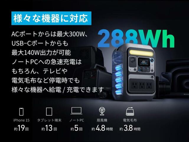 バッテリー容量が288Whとややコンパクトめではありますが、それでもスマホを約19回、扇風機を約4.8時間くらいの目安で使うことができます。