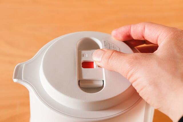 フタを閉めたら、天面にある「給湯ロックレバー」をスライドして給湯ロック状態(白色)にします。