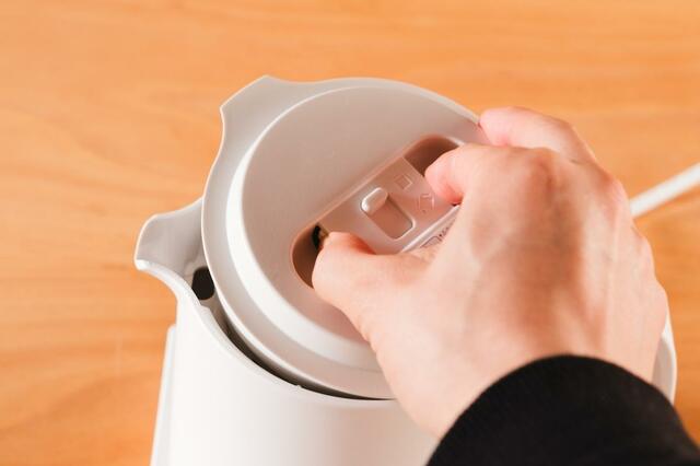 フタを開ける際は、つまみを指で挟みながら持ち上げます。
