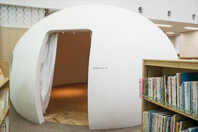 読み聞かせができる「おはなしのへや」は多摩川の水滴を表したデザインになっている。