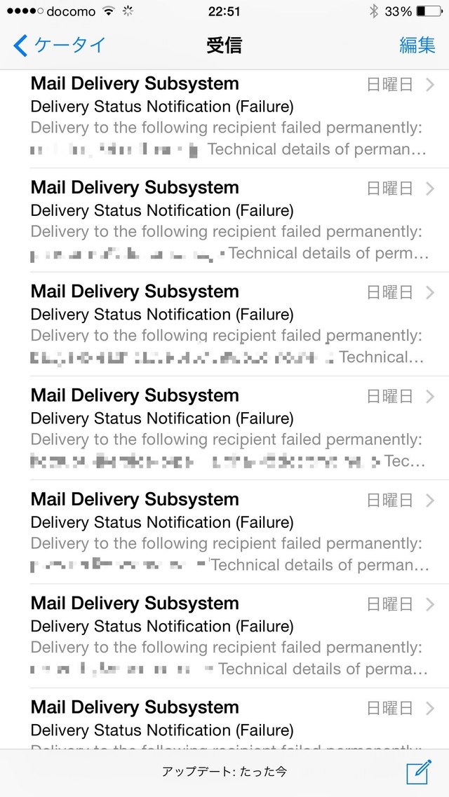 しかし、帰ってくるわ帰ってくるわでご覧の有様です。そう、迷惑メール対策で多くの人がパソコンなどのメール受信を拒否しているんです……。
