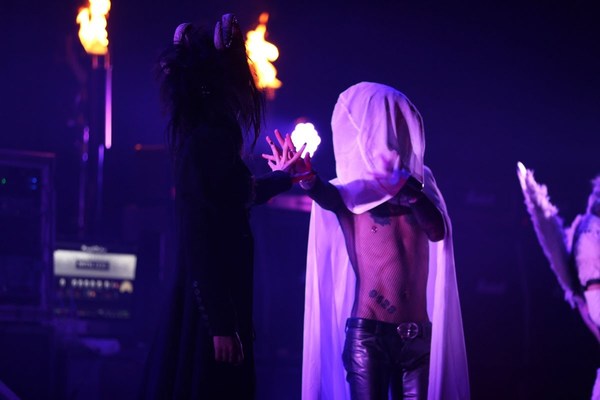 ステージいっぱいにスモークが焚かれ、『醜詠』。黒い角を生やしたバフォメットと白いローブをかぶった「二人の綴」が手を取り合い、抱き合い、踊り続けます。背景にはトーチの炎があやしくゆらめきます。黒い綴が消え、白い綴にスポットライトがあたり、ローブを脱ぎ捨て『剥落』へ。4体の美しい化け物の世界に完全に引き込まれ、会場全体がまるで地獄の底のような美しさを湛えていました。