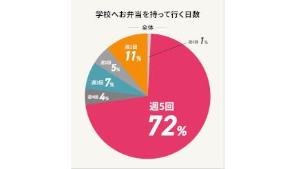 調査対象者のうち、子どもが学校にお弁当を持参していると答えた人に、週に何日持って行っているかを尋ねたところ、「週5日」が70%超を占めた。
