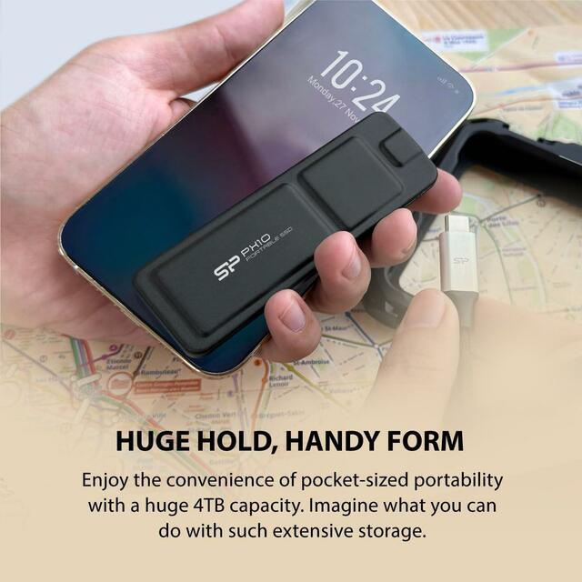 Silicon Power(シリコンパワー)の「PX10 4TB」は、USB 3.2 Gen 2 PCIe NVMeテクノロジーにより、最大1,050 MB/秒の驚異的な読み取りと書き込み速度を実現したポータブル外付けSSDです。