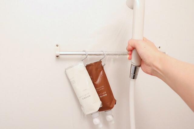 お風呂場のタオルバーなどにぶら下げればセット完了。