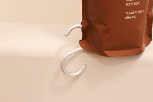 お風呂場で使うときはS字フックにぶら下げます。パッケージの底面サイドに穴が空いているので差し込むだけでOK。