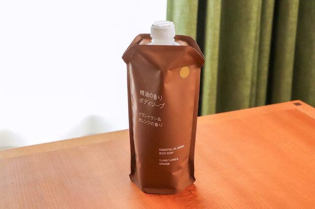 今回は、無印良品の「精油の香り ボディソープ イランイラン&オレンジの香り(詰替用)」にノズルをつけてみます。