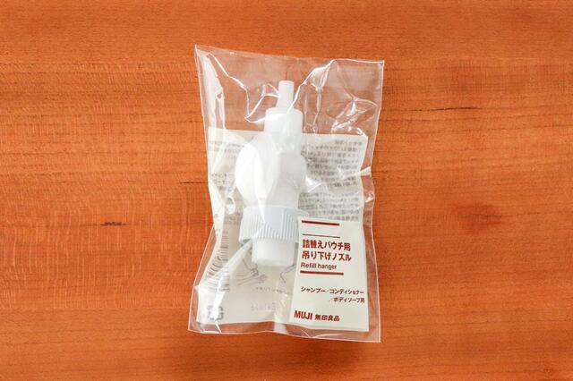 それが、無印良品の「詰替えパウチ用吊り下げノズル」です。