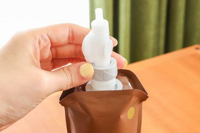 詰替用についているキャップを取り、封をするようにノズルをつけるだけ。
