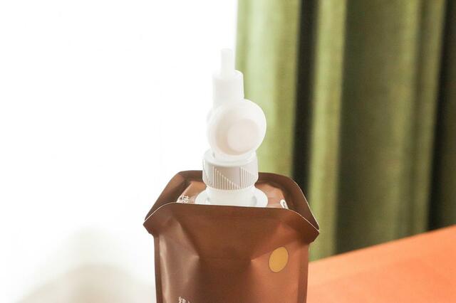 ノズルが細くなっているため、ジムや旅行用のミニボトルへ詰め替えるときもスムーズ。サッと適量詰め替えられました。