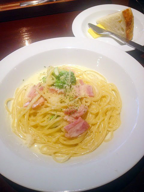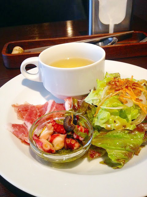 ランチの前菜サラダとスープ。京都らしいはんなりとしたカルボナーラ。