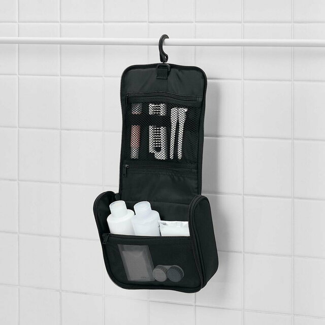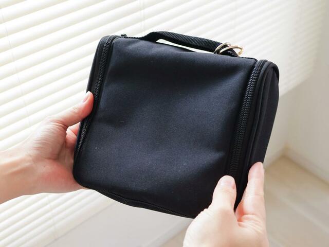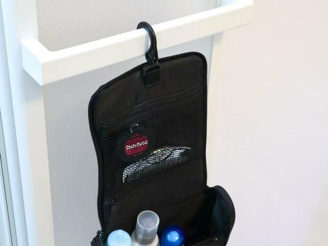 旅行に限らずサウナや帰省と、幅広くスキンケアグッズの持ち運びに活躍するのが「ポリエステル 吊るして使える洗面用具ケース」。