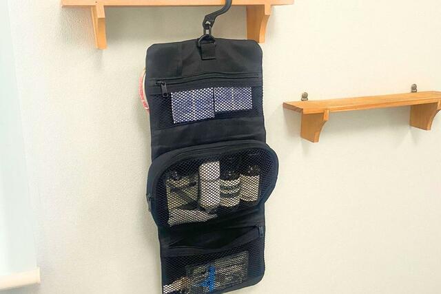 洗面台のタオルかけに、付属のフックでかけておけばスペースも取らずに必要なものを手に取れるので、すごく重宝しています。ポケットがたくさんあるので、コンタクトや絆創膏、小さな爪切りやハサミなど何かと必要になりそうなアイテムの収納にも使ってます。