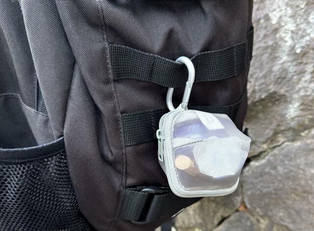 この「コンパクトポーチ」、立体的でサイズの割にはたくさん入ります。また、カラビナが付いているのでカバンの外に取り付けも可能。