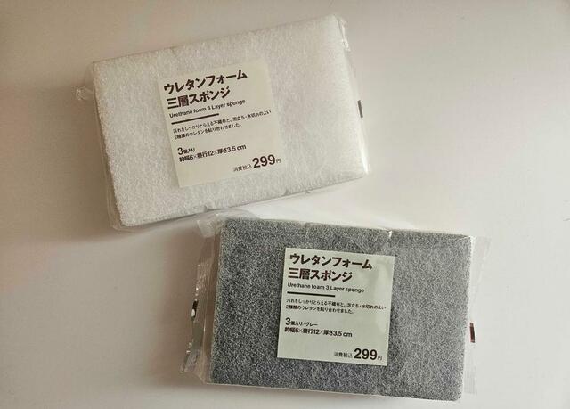 汚れをとらえる不織布とウレタンを貼り合わせたタイプのスポンジ。無印良品でスポンジを買うのは初めてですが、グレーと白があり、揃えられるところに惹かれました。