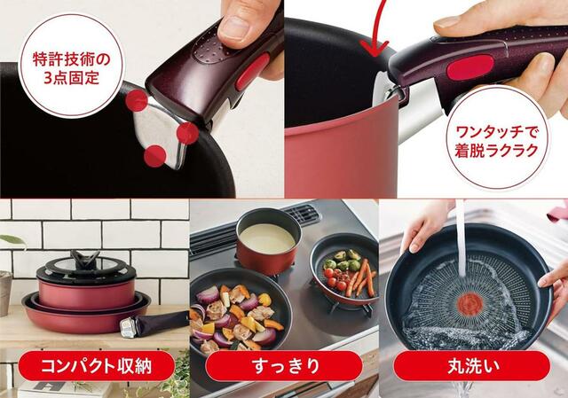 取っ手がとれるから、重ねてスッキリ収納できる&丸洗いが楽ちんな点が魅力のティファールのフライパン。