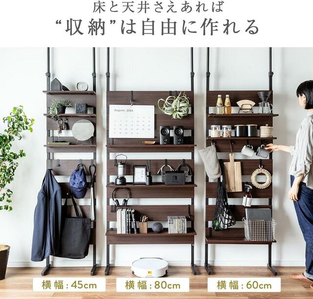 サンワダイレクトの突っ張り式ラックは、今回紹介した幅45cmの「100-TSF001W」以外に幅60cmの「100-TSF002W」と幅80cmの「100-TSF003W」があり、組み合わせて大きな壁面収納を作ることも可能。色もホワイトとダークブラウンの2色展開なので、お部屋のインテリアに合わせて選ぶことができます。