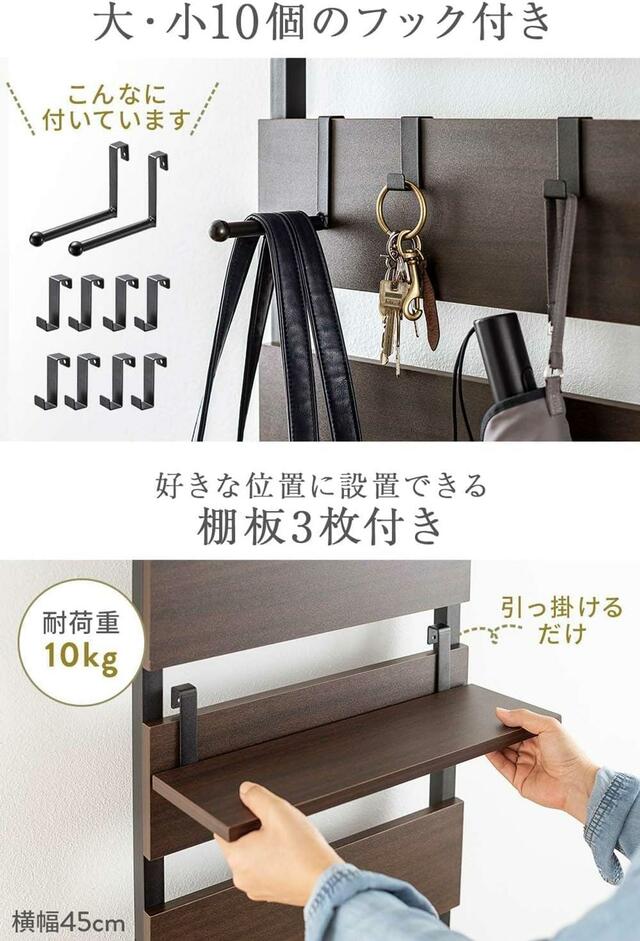 フックは10個(大×2個、小×8個)付属しているので、バックや鍵など細々としたアイテムを引っ掛けてスッキリ収納することが可能。フックはパネルの裏面からも使えるので、省スペース化が図れます。