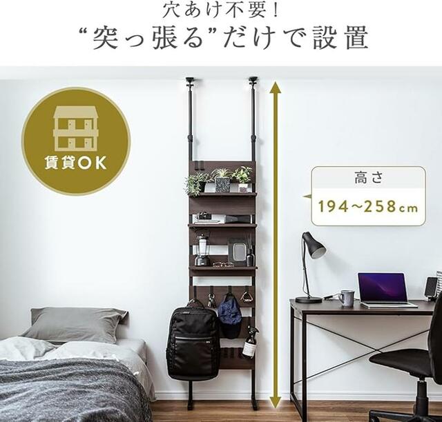 壁に穴を開ける必要が無いので、マンションやアパートなどの賃貸物件でも設置できます。高さは194~258cmまで調整可能で、パーテーションや間仕切りとしても使える柔軟性も◎。