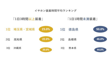 さらに、イヤホンを装着(使用)している時間の1日平均をたずねると、「1~3時間未満」が約半数を占めて最多で、「3~5時間未満」「5時間以上」を合わせて「1日3時間以上装着」した人に限ると「埼玉県」「宮城県」が同率1位で並び、2位・3位には「高知県」と「沖縄県」が続きました。