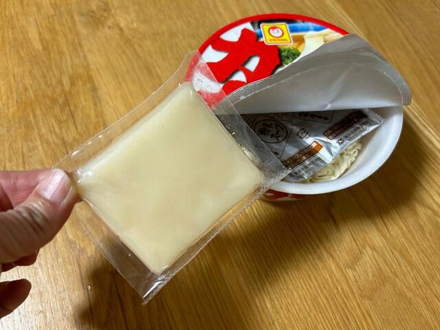 袋を開けて麺の上にのせ、かやくも一緒にのせて熱湯を注ぎます。