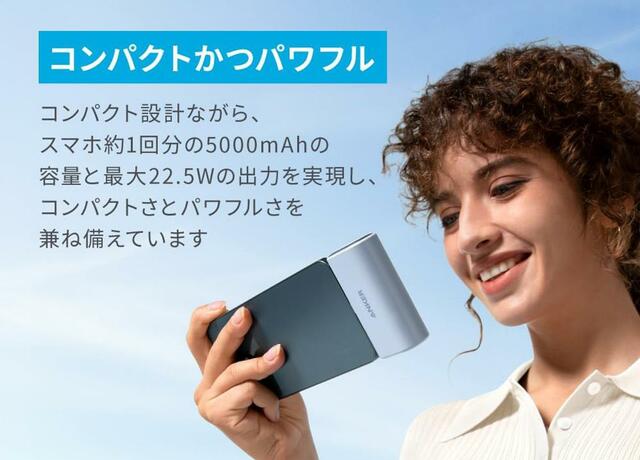 5,000mAhの容量でスマホを約1回フル充電可能。さらに、最大22.5Wの急速充電にも対応しています。