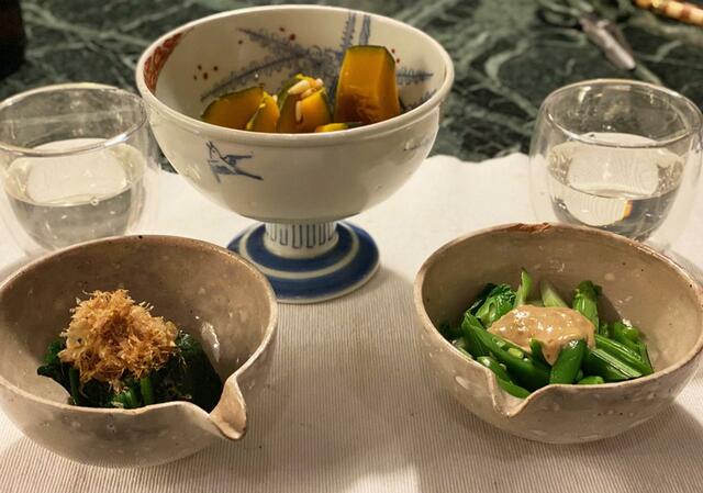かぼちゃ煮、ほうれん草おひたし、スナップエンドウと春蕾の胡麻和え。