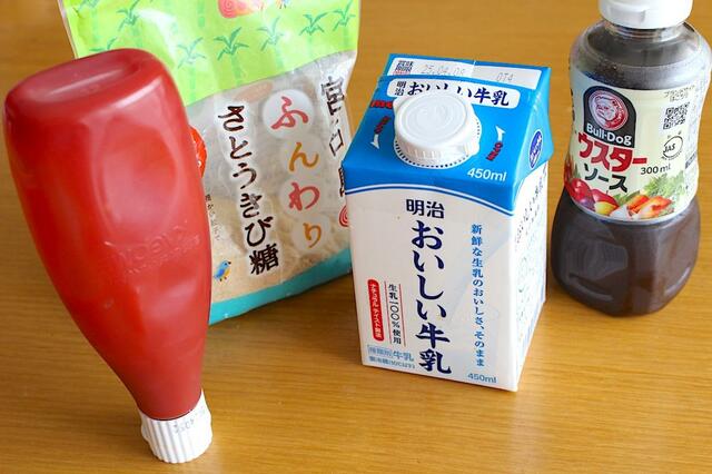 我が家で作るナポリタンのソースの材料は、ケチャップ・牛乳・ウスターソース・砂糖。