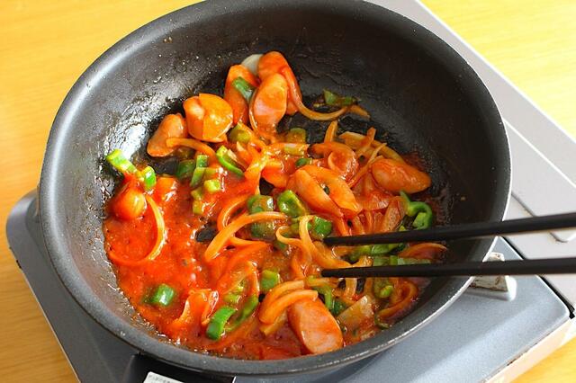 3. 2のフライパンにケチャップ、牛乳、ウスターソース、砂糖を入れ、加熱しながら具材と混ぜ合わせて塩&コショウする(事前にケチャップソースの材料を混ぜておき、それをフライパンに入れてもOK)