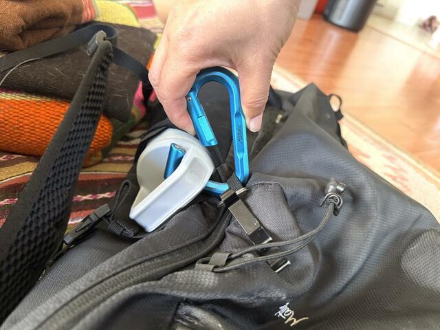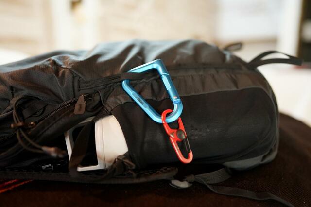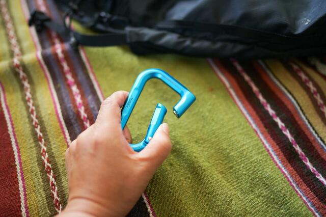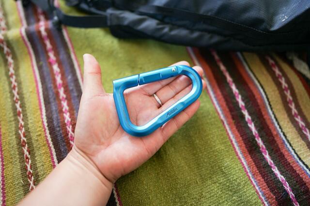 航空機グレードのアルミニウムで丈夫。カラビナとして水筒や靴などをバックパックに固定でき、日常使いができるアイテム。