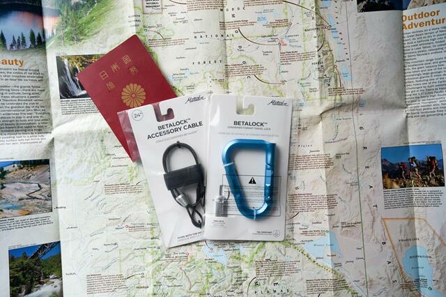 その中のカギ付きカラビナ「ベータロック」と「ベータロックアクセサリーケーブル」が旅の防犯対策にかなり活躍しています。