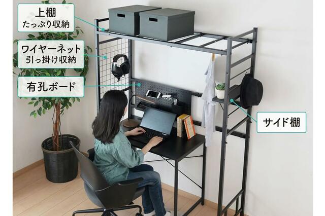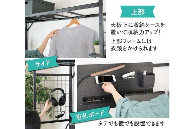 収納ボックスなどを置ける上棚に加え、ワイヤーネットとサイド棚、有孔ボードがついています。