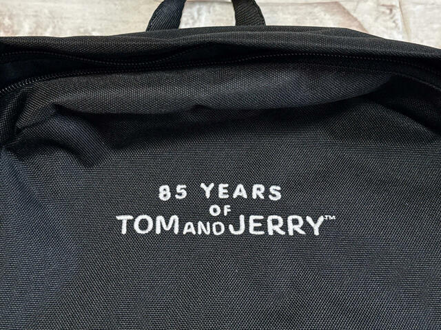 フラップなどはない一般的なバックパック型で、正面上部には、ホワイトの「85 YEARS OF TOM ANDJERRY」の刺繍入り。