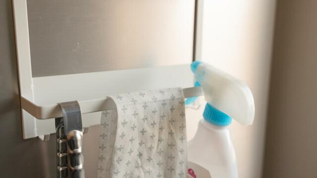下段のハンガーには、布巾や除菌スプレーボトルなど収納場所に困りやすいような小物を吊るして収納できます。