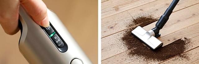 ブラシレスモーターによるパワフルな吸引力を備えており、手元のスイッチで「標準/強/ソフト」の3段階切り替えも可能です。