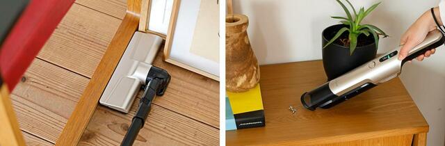 写真左のように可動域が自由なので、壁際やソファ下などの狭い場所の掃除もラクラク。