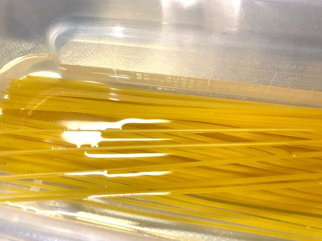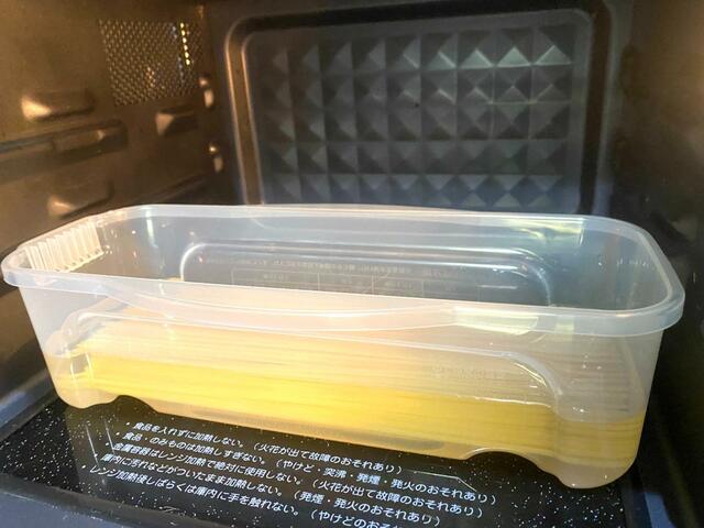 あとは、パスタの規定の茹で時間にプラス5分して電子レンジで加熱するだけ!