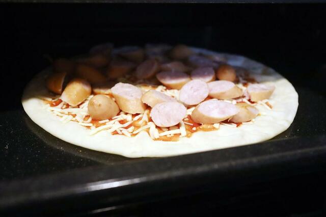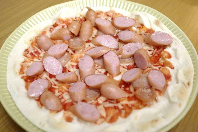 せっかくなので、家にあったソーセージを追加して「爆盛りソーセージピザ」にグレードアップしちゃいました。