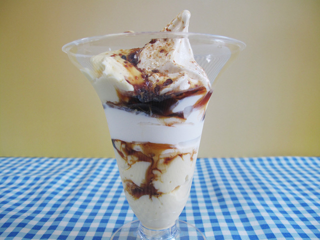 キャラメルソースがプリンの上にもソフトクリームの上にもかかっているせいか、ソフトクリームとの一体感がありながらそれでいてしっかりとプリンも味わえる、最後のひと匙まで美味しいプリンパフェに仕上がっています。