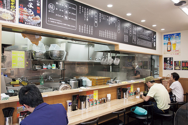 アットホームな雰囲気が漂うお店。クリーミーでクセになるスープをよりおいしく食べられるようにという思いから、卓上調味料が充実している。生玉ネギやニンニクなど、その日の気分で試したい。