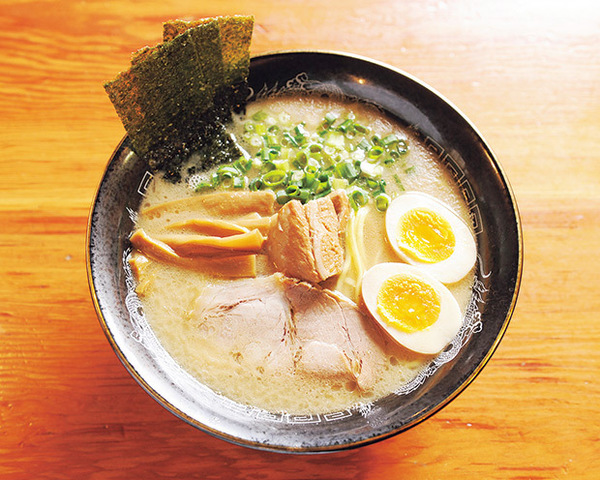 たっぷりのトンコツをじっくりと煮詰めた濃厚なスープに角煮と味玉を加えると、甘みが加わり表情がグッと変わる。麺は太麺と細麺から選ぶことができる。