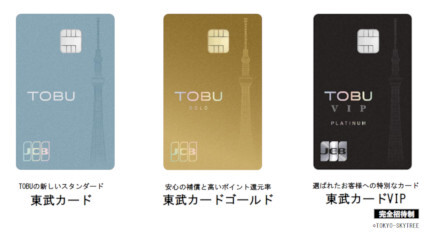 5月29日から新規入会受付を開始するのは、「東武カード」「東武カードゴールド」と完全招待制「東武カードVIP」の3種類で、東京スカイツリーがシルエットのように浮かび上がる縦型デザインとなっている。国際ブランドはJCBのみ。AppleとGoogleのデジタルウォレットサービスに対応し、事前に登録するとスマホ1台で移動も買い物もできる。