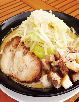 増量無料の野菜がそびえる二郎系の一杯。ニンニクは野菜とよく合う自家製のものを使用。また、濃い目の味つけが特徴のスープには一日に豚ガラを約300kgも使用しているという。