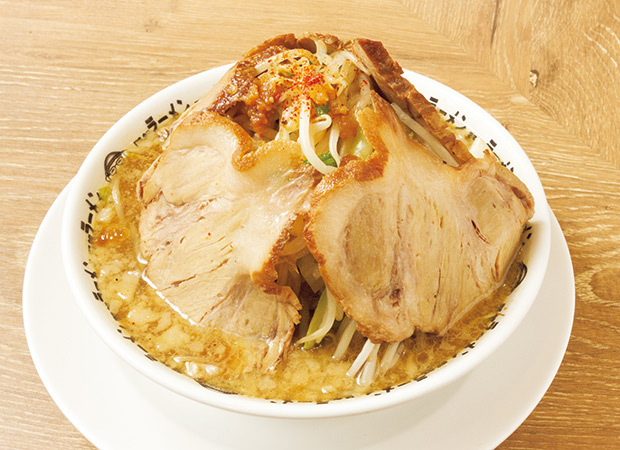 香ばしい炙りチャーシューが自慢の二郎系を味わえる。魚粉を入れることで魚介の味を利かせたスープは、しつこくなく、あっさりしている。こだわりの太麺に絡めて味わおう。