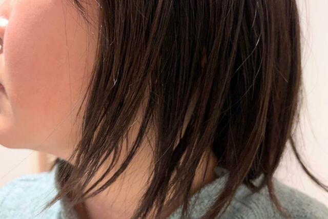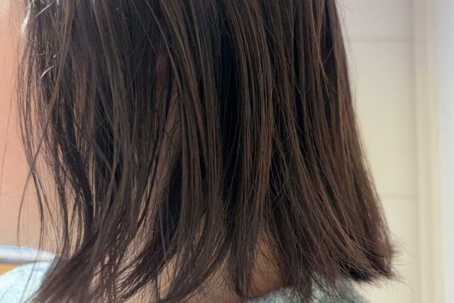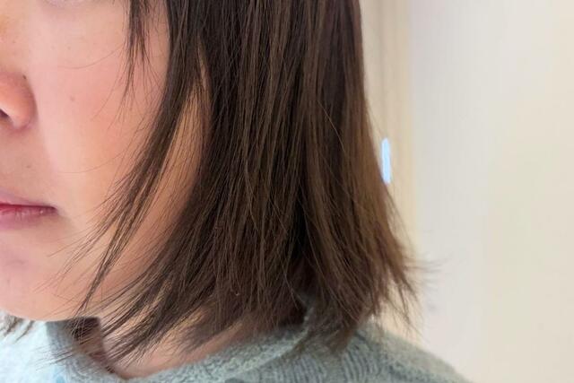 なにもつけていない状態の筆者の髪の毛はこんな感じ。紫外線ダメージを受けやすいのか、春夏は特に色落ちとパサつきが目立ちます。