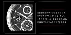 35周年を記念して作られた腕時計は作中に登場する地球統合軍をモチーフにしたデザインとなっており、9時、12時、6時の位置にサブダイヤルが配置され、9時の位置あるサブダイヤルには「地球統合軍マーク」があしらわれています。時分針とインデックスにはルミブライトを施し、夜間でも高い視認性を確保。